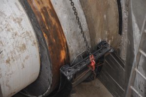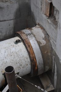 Riparazione di una perdita su una vecchia fascia in acciaio installata in passato da un'azienda concorrente sulla condotta dell'acquedotto principale.